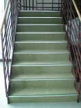 左:正面玄関につながる階段。/中:事務室など。/右:基礎部分の外壁塗装も完了。